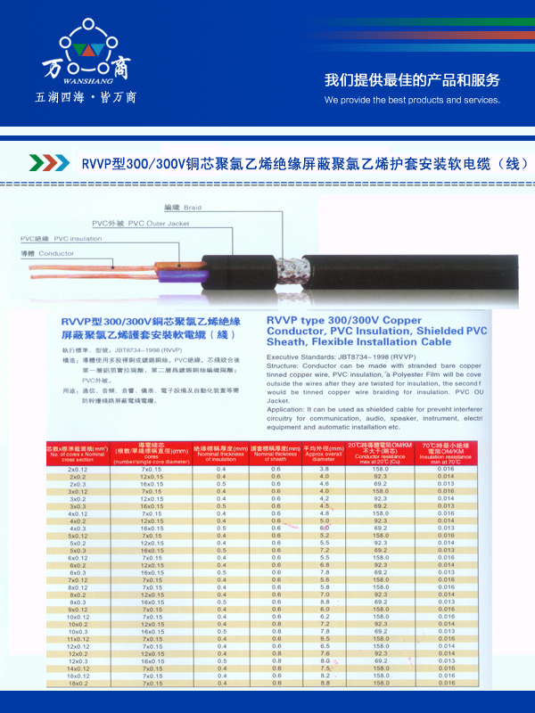 RVVP型300300V铜芯聚氯乙烯绝缘屏蔽聚氯乙烯护套安装软电缆(线)